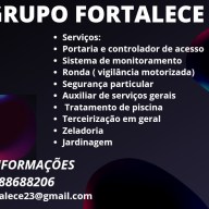 Serviços: portaria e controlador de acesso, ronda (vigilância motorizada), zeladoria, auxiliar de serviços gerais, jardinagem, tratamento de piscina, sistema de monitoramento, segurança particular, terceirização em geral